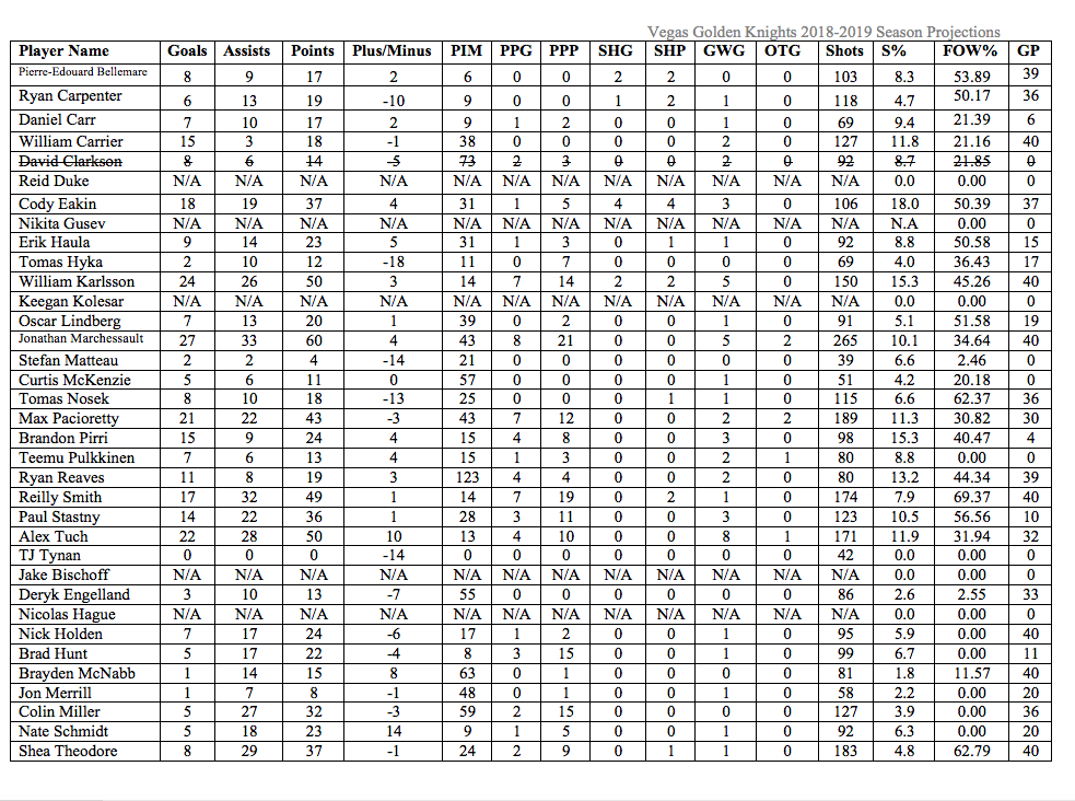 Tuch is expected to lead in assists (33), followed by Smith (30) and Marchessault (29), while Marchessault is destined to lead in points (54) over Tuch (53) and Karlsson (44).